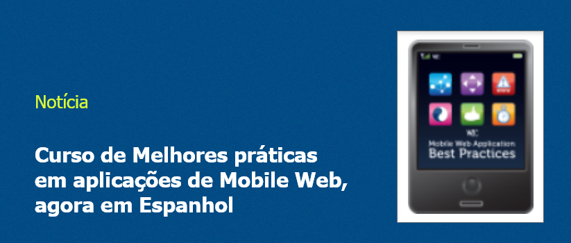 Completamente baseado nos padrões web, o curso online é direcionado para produtores, designers e desenvolvedores de conteúdo, e oferece a familiaridade necessária com aplicações web que necessitam estar protas para Web Mobile. A primeira turma do curso oferecido totalmente em Espanhol, está terá início em 03 de setembro de 2012. Mais informações em: http://www.w3devcampus.com/buenas-practicas-en-web-movil/ (Em Espanhol)